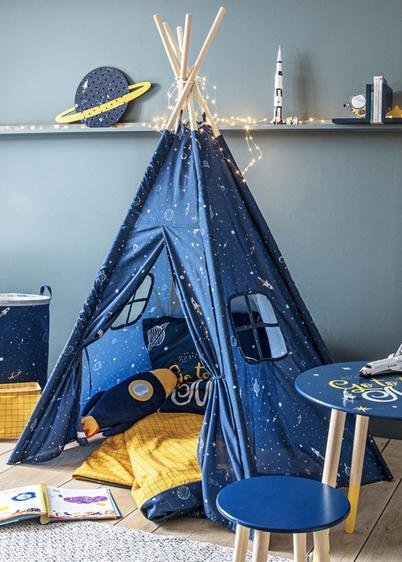 Dětský hrací stan ve tvaru indiánského teepee s motivem vesmíru bude skvělou zábavou pro každého malého kosmonauta. Je vybaven dvěma bočními okénky, zapínáním na suchý zip a provázky pro zajištění konců v otevřeném stavu. Ideální do dětského pokojíčku i ven na zahradu.