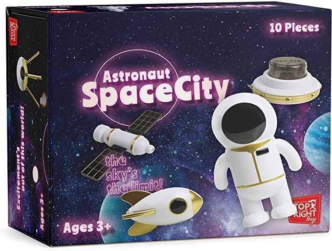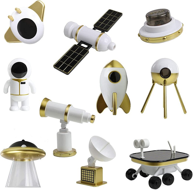 - Hrací sada s vesmírnou tématikou obsahuje 10 kusů různých hraček: astronaut, vesmírná loď, raketová loď, dalekohled, satelit, 2 ks UFO, létající talíř, rover a družice