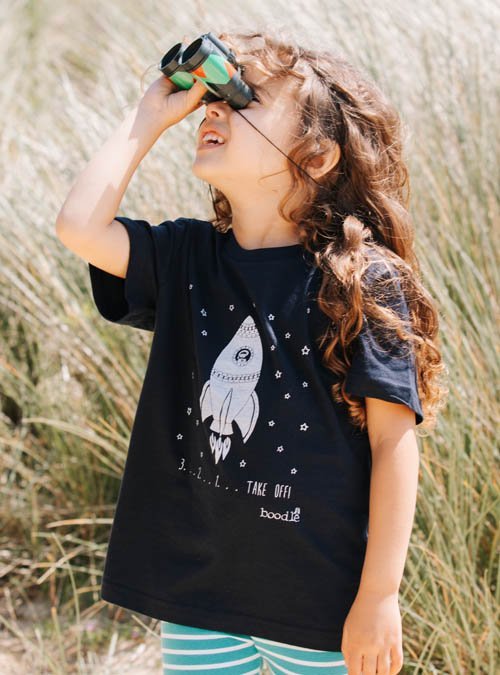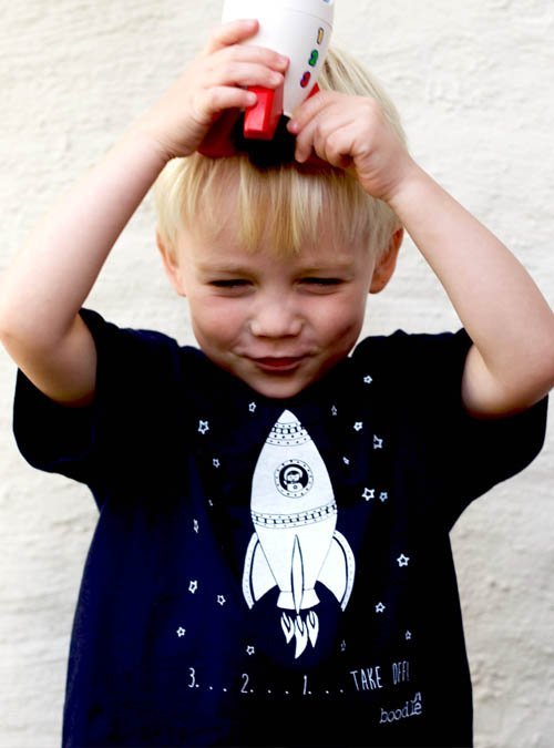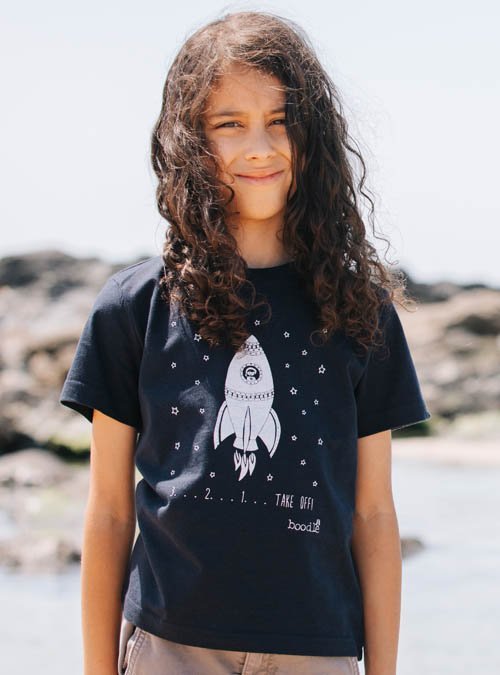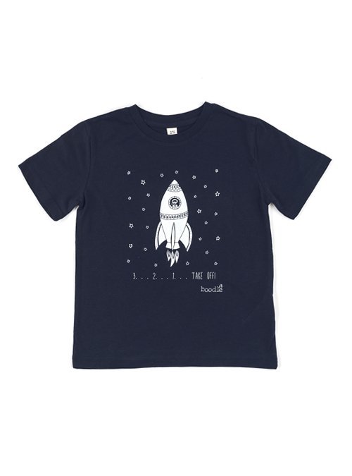 Miluje vaše dítě vesmír? Pak bude šťastné v tričku s motivem stoupající rakety! Tmavě modré tričko z organické bavlny je zepředu potištěno kvalitní bílou barvou a je vhodné pro kluky i holky.